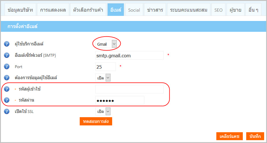 3. ทำการกำหนดข้อมูลเพื่อตั้งค่าอีเมล์ โดยมีตัวอย่างของการตั้งค่าอีเมล์ ดังนี้