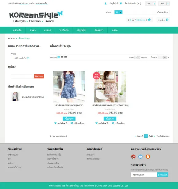 รูปแบบร้านค้าออนไลน์ เน้นการใช้โทนสีเขียว สีฟ้า ให้ความรู้สบายตา แต่คงไว้ด้วยรูปแบบที่ทันสมัย เหมาะกับการขายสินค้าแฟชั่นเสื้อผ้า กระเป๋า หรือเครื่องประดับ
