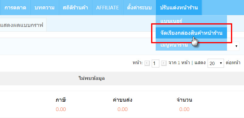 1. ให้คุณเข้าสู่ระบบจัดการร้านค้าออนไลน์ของคุณ จากนั้นไปที่เมนู "ปรับแต่งหน้าร้าน" เมนูย่อย "จัดเรียงกล่องสินค้าหน้าร้าน"