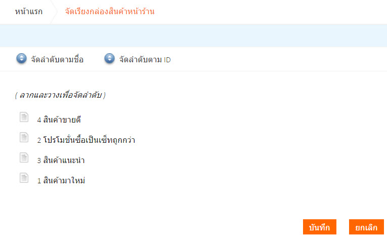 หรือ ID คุณสามารถเรียงลำดับกล่องสินค้าด้วยตัวเองได้ โดยการคลิกค้างไว้ที่ชื่อกล่องสินค้าที่คุณต้องการเปลี่ยนตำแหน่ง