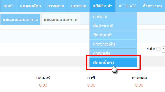 1. ให้คุณเข้าสู่ระบบจัดการร้านค้าออนไลน์ของคุณ จากนั้นไปที่เมนู "สถิติร้านค้า" เมนูย่อย "สต๊อกสินค้า"
