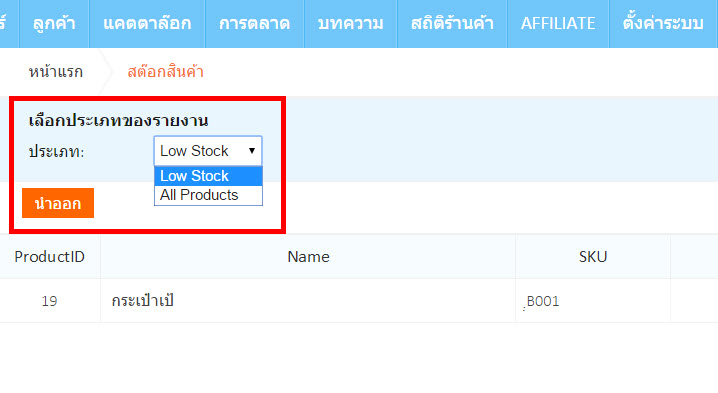 - Low Stock : แสดงรายการสินค้าที่หมดจากสต๊อกไปแล้ว (สินค้า 0 ชิ้น)