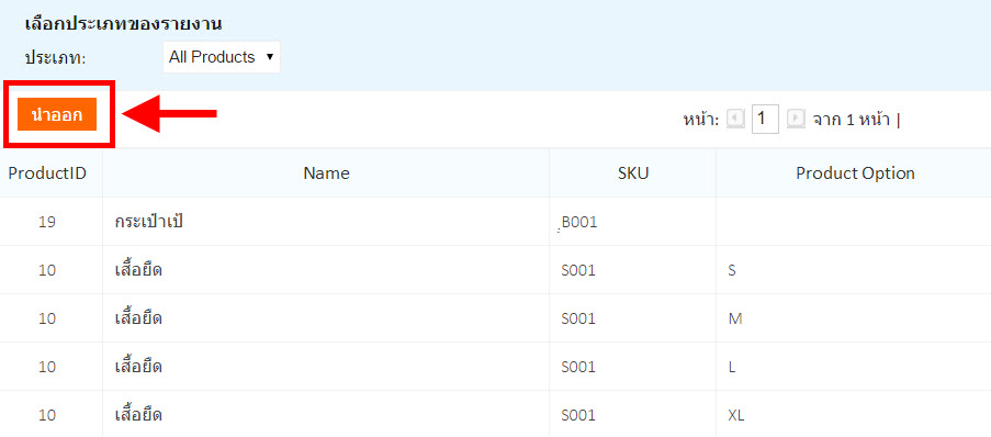3. เมื่อคุณเลือกประเภทแล้ว ระบบจะแสดงรายการสินค้าตามประเภทที่คุณเลือกเอาไว้ ถ้าหากคุณต้องการดาวน์โหลดรายงานสต๊อกสินค้า