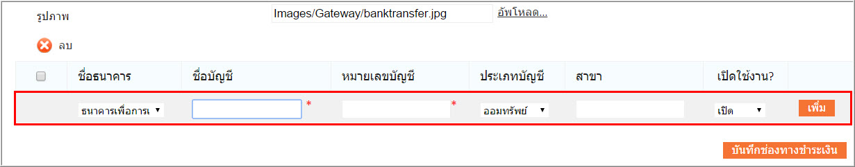 - เพิ่ม : เพื่อทำการเพิ่มธนาคารที่คุณมีบัญชีที่ต้องการให้ลูกค้าชำระเงิน