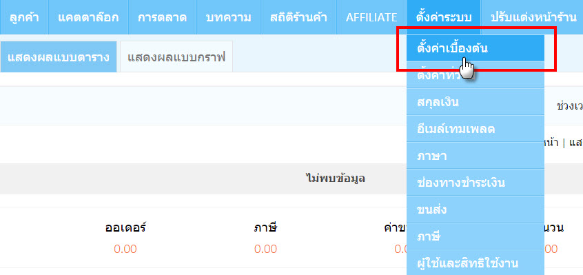 1. ให้คุณเข้าสู่ระบบจัดการร้านค้าออนไลน์ของคุณ จากนั้นไปที่เมนู "ตั้งค่าระบบ" เมนูย่อย "ตั้งค่าเบื้องต้น"