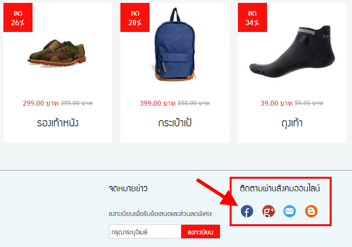 - และเมื่อคุณหรือลูกค้าเข้ามาที่ร้านค้าออนไลน์ของคุณ พื้นที่ด้านล่างสุดทางด้านขวามือ จะมีพื้นที่ "ติดตามผ่านสังคมออนไลน์" ทั้งคุณและลูกค้าจะพบกับสัญลักษณ์ Facebook และเมื่อคลิกเข้าไปแล้วก็จะพบกับ Facebook Page