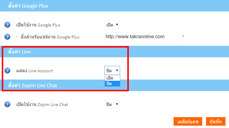 และนำโค้ดที่ได้จาก Zopim มาใส่ในพื้นที่ Zopim Live Chat Script แล้วคลิก "บันทึก"